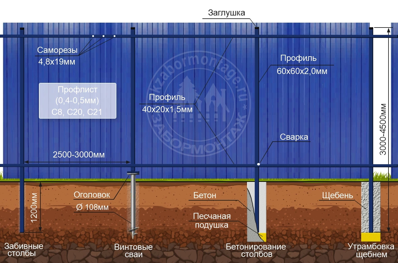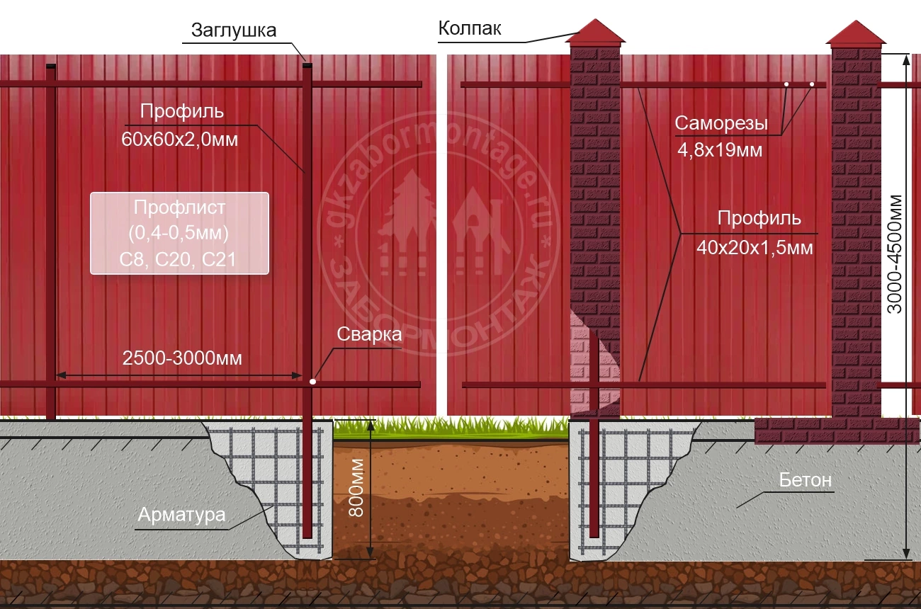 Конструкция забора из профлиста на ленточном фундаменте