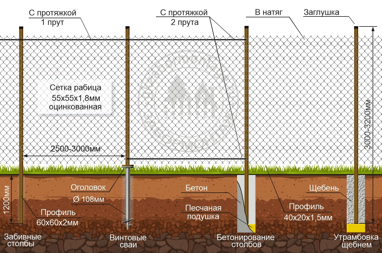 • Конструкции забора из сетки-рабицы в натяг и с протяжкой арматуры