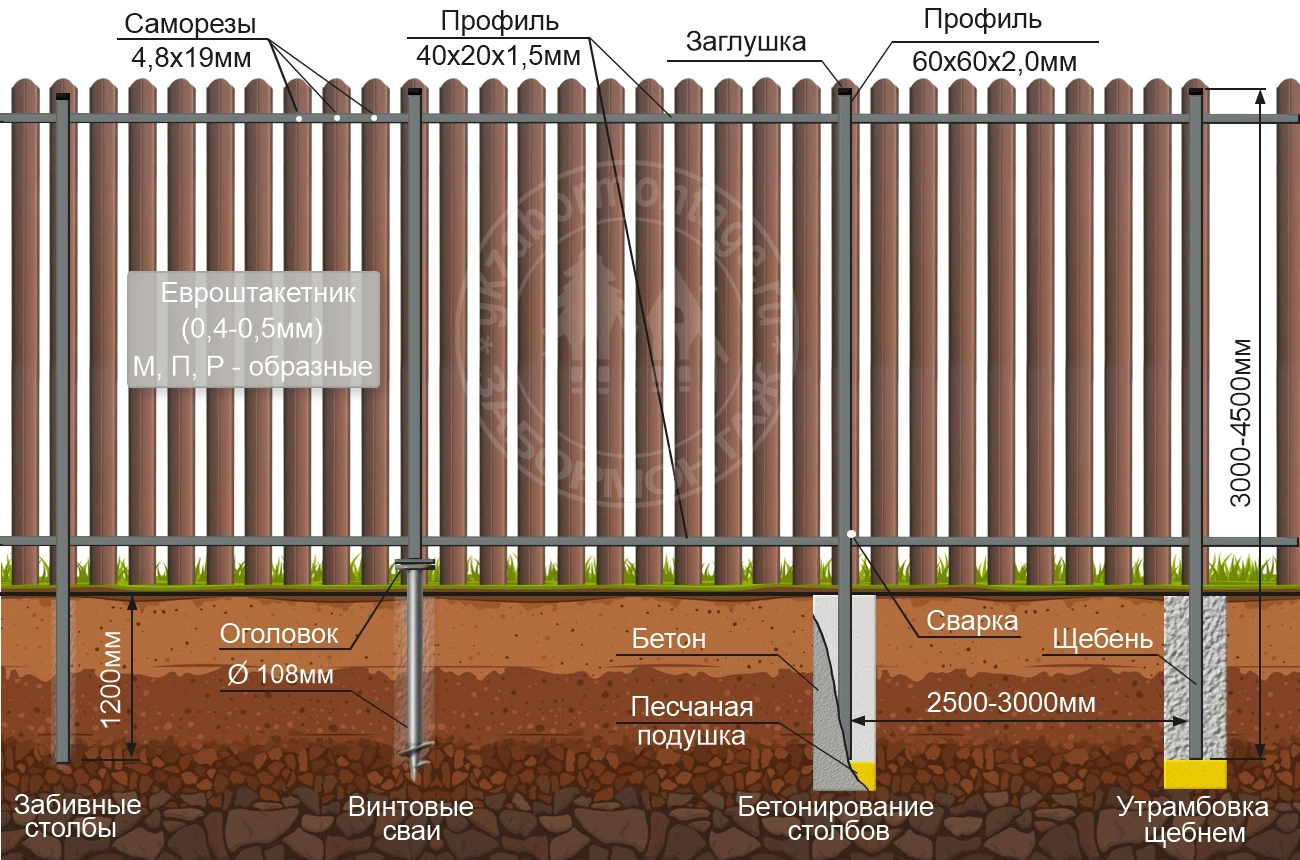 Конструкция забора из евроштакетника на ленточном фундаменте