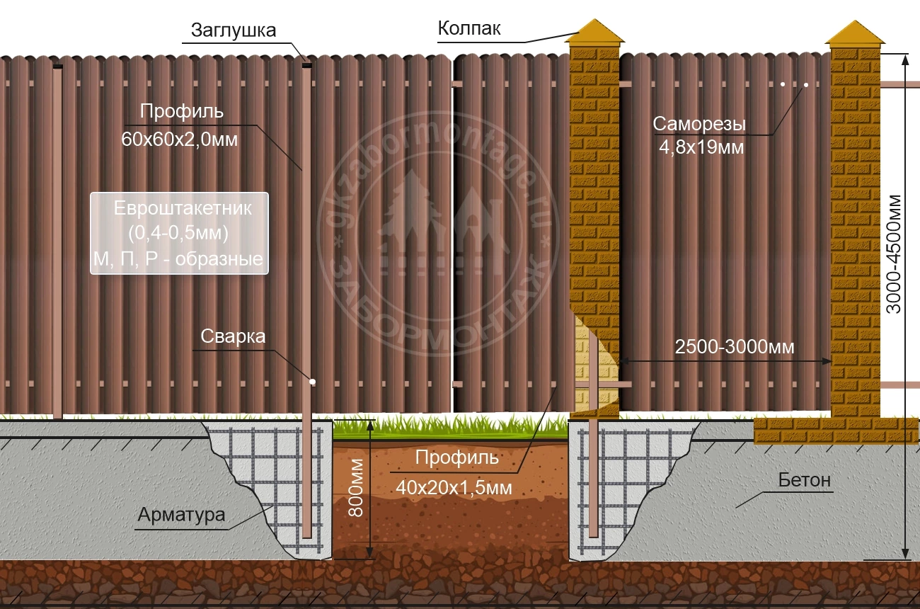 • Конструкция забора из профлиста на ленточном фундаменте